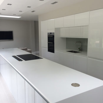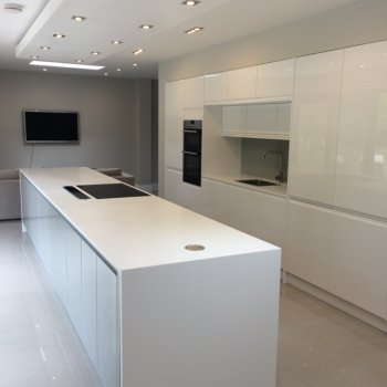 Wszystkie kuchenne blaty powstały z materiału Corian®, znanego ze swojej wysokiej trwałości, jednolitej struktury i łatwości w utrzymaniu czystości. Wyspa kuchenna posiada zintegrowaną płytę indukcyjną oraz przelot na gniazdko (okrągła zaślepka), co świadczy o przemyślanym projekcie pod kątem funkcjonalności. Nasz niezawodny Corian® jest również zastosowany w blacie roboczym przy zlewie — jego bezspoinowe łączenia z frontami i ścianą nadają kuchni jednolitą, monolityczną formę.