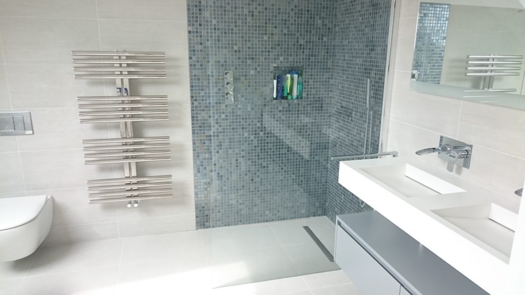 Łazienka Corian z drewnianą zabudową w Pruszczu Gdańskim
