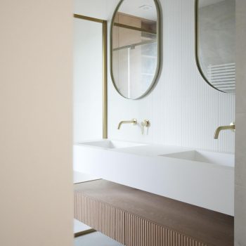 Kolorystyka wnętrza bazuje na neutralnych i naturalnych tonach– czysta biel, delikatna szarość, jasne drewno i złote akcenty. Szafka podblatowa jest wykonana z pionowych, ryflowanych frontów z naturalnego drewna, co wprowadza ciepło i strukturę do całej kompozycji. Złote baterie podtynkowe i listewka ścianki prysznicowej dodają wnętrzu luksusowego wykończenia. Lustra nad umywalkami powiększają optycznie wnętrze i stanowią estetyczną ozdobę ściany.Tło łazienki to biała ściana z pionową, delikatną strukturą, która podobnie jak lustra, optycznie wydłuża przestrzeń i współgra z frontami szafek podblatowych.