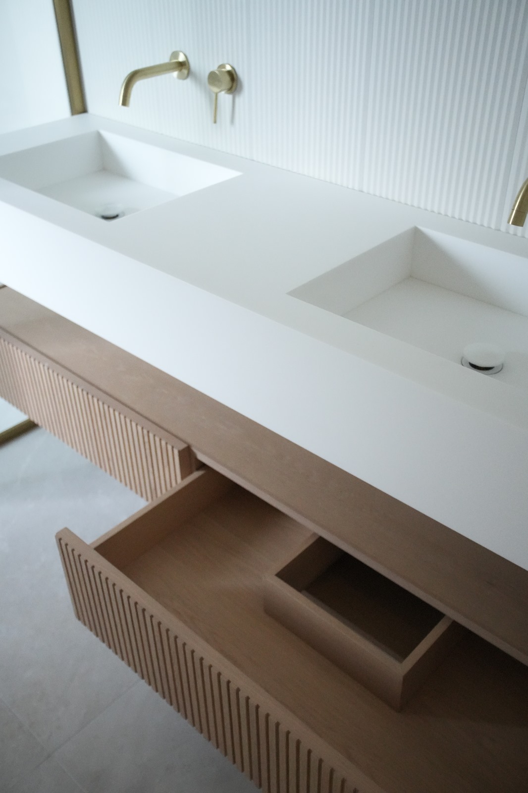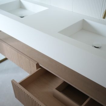 Podwójna umywalka na wymiar Corian® została wykonana z wysokiej jakości materiału, który gwarantuje trwałość, higienę i elegancki wygląd przez lata. Śnieżnobiała umywalka stanowi jednolity, zintegrowany element z blatem w tym samym kolorze. To sprawia, że całość zachowuje minimalistyczną estetykę i bezszwową formę. Blat Corian® jest ponadto trwały, odporny na zabrudzenia i wilgoć, dlatego sprawdzi się do nowoczesnych łazienek, które są użytkowane na co dzień.