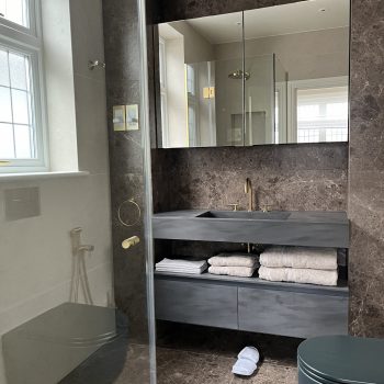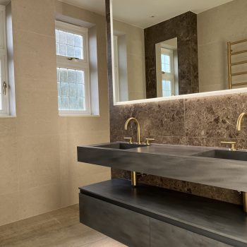 Centralnym punktem łazienki jest duży, długi blat z dwiema umywalkami Corian®. Ta podwójna umywalka jest idealnie zintegrowana z blatem, tworząc jedną, bezszwową bryłę. Tworzy to nie tylko estetyczny efekt, ale także niezwykle higieniczny. Ze względu na brak łączeń wyeliminowane są miejsca, w których mogłyby gromadzić się zabrudzenia.