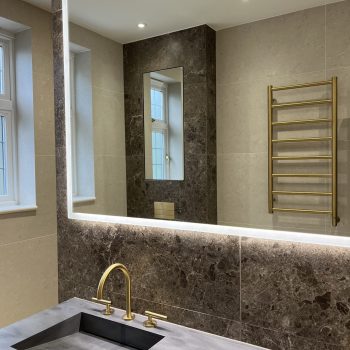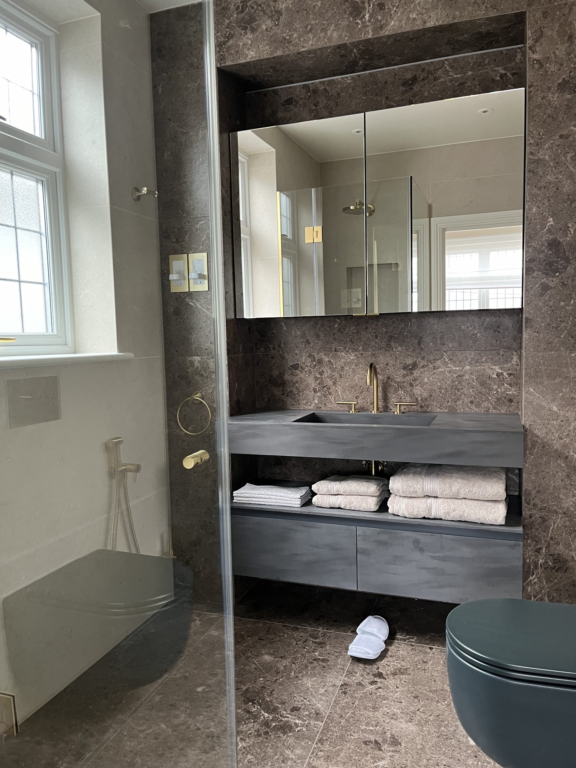 Łazienka utrzymana jest w stylu nowoczesnym, z elementami industrialnymi i minimalizmem, ale wzbogaconymi o akcenty glamour. Na dominującą kolorystykę składają się tutaj: ciemny grafit wpadający w antracyt oraz ciepłe odcienie beżu i brązu. Ciemnoszara umywalka Corian® z blatem i podwieszaną szafką ładnie współgrają z brązowym tłem i kontrastują z jasnym otoczeniem łazienki. Dzięki temu, cała aranżacja prezentuje się nowocześnie i wyrafinowanie.