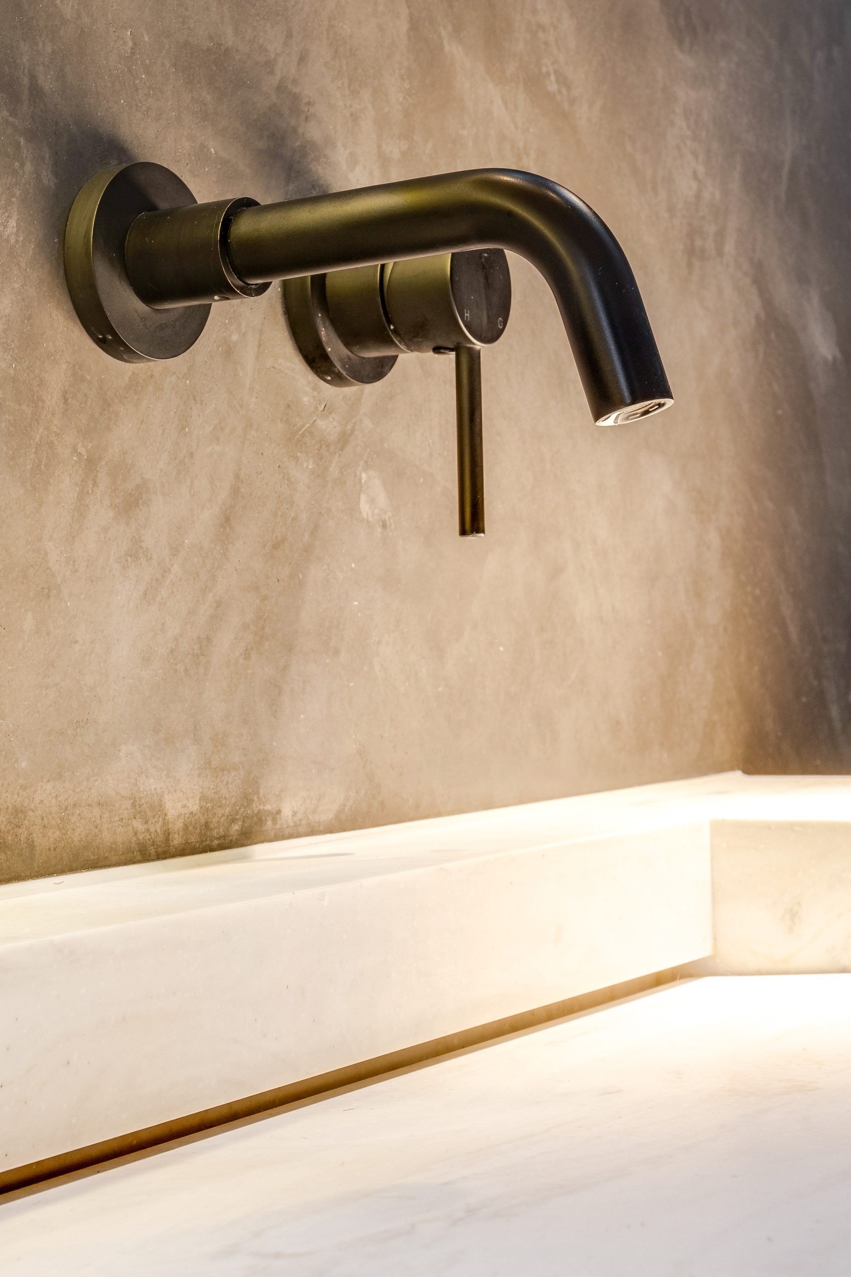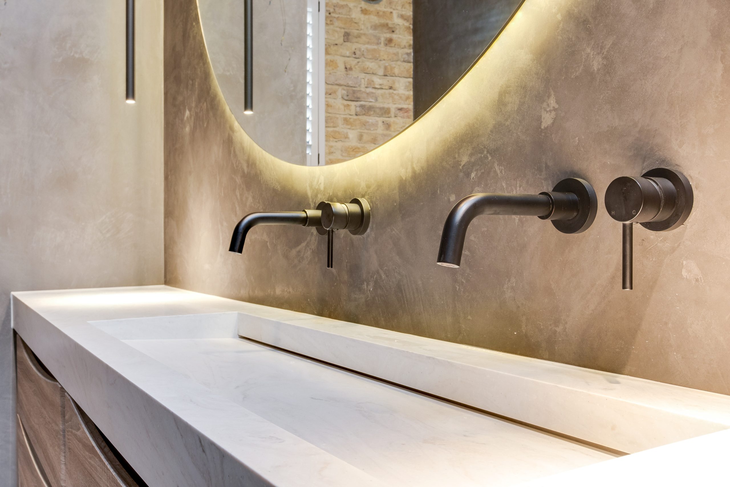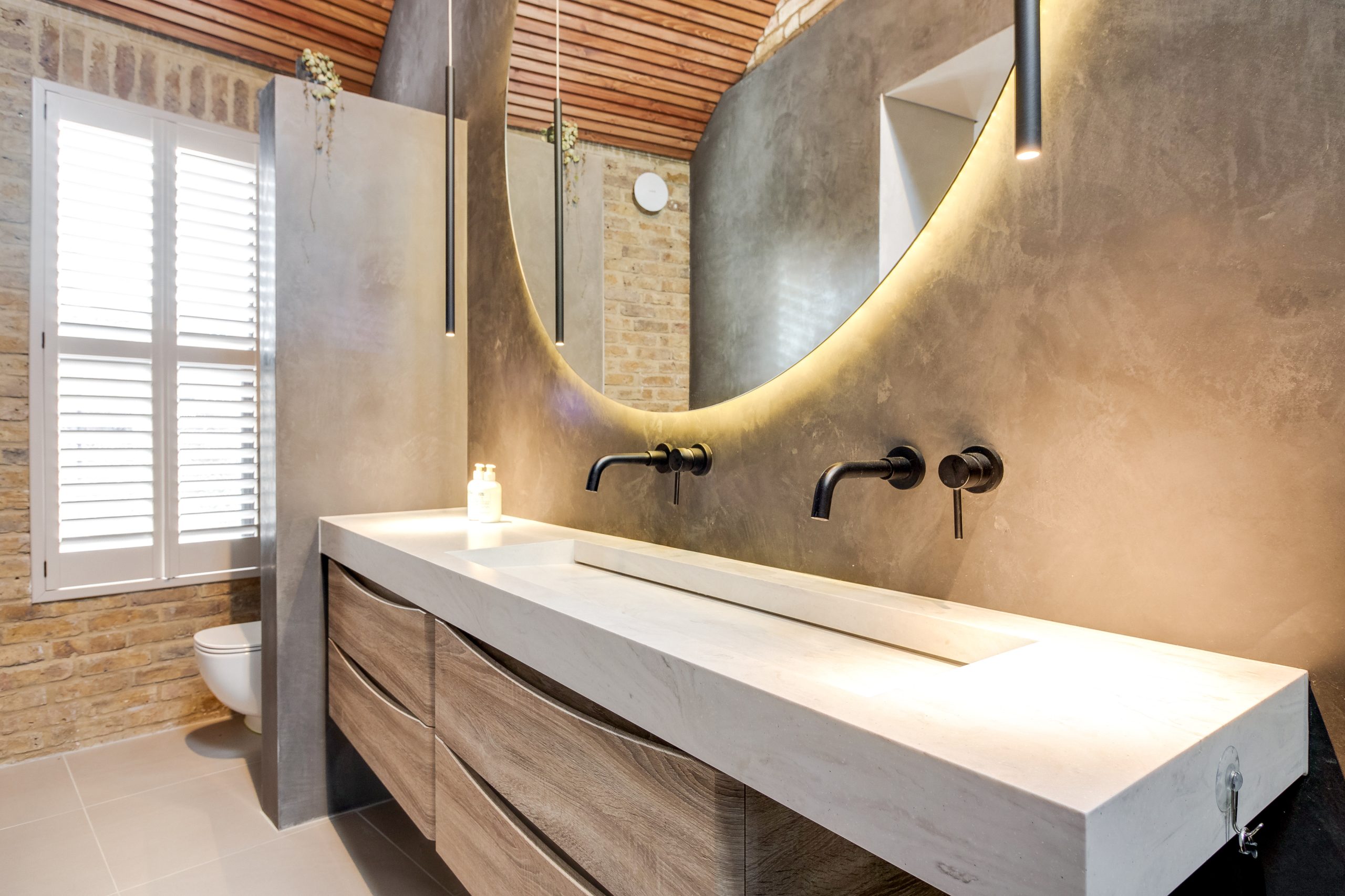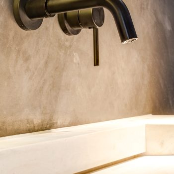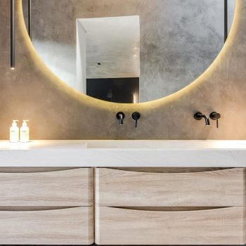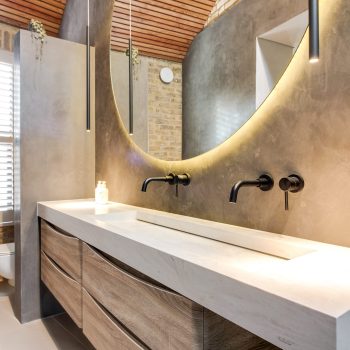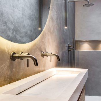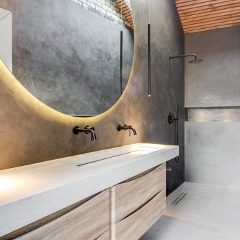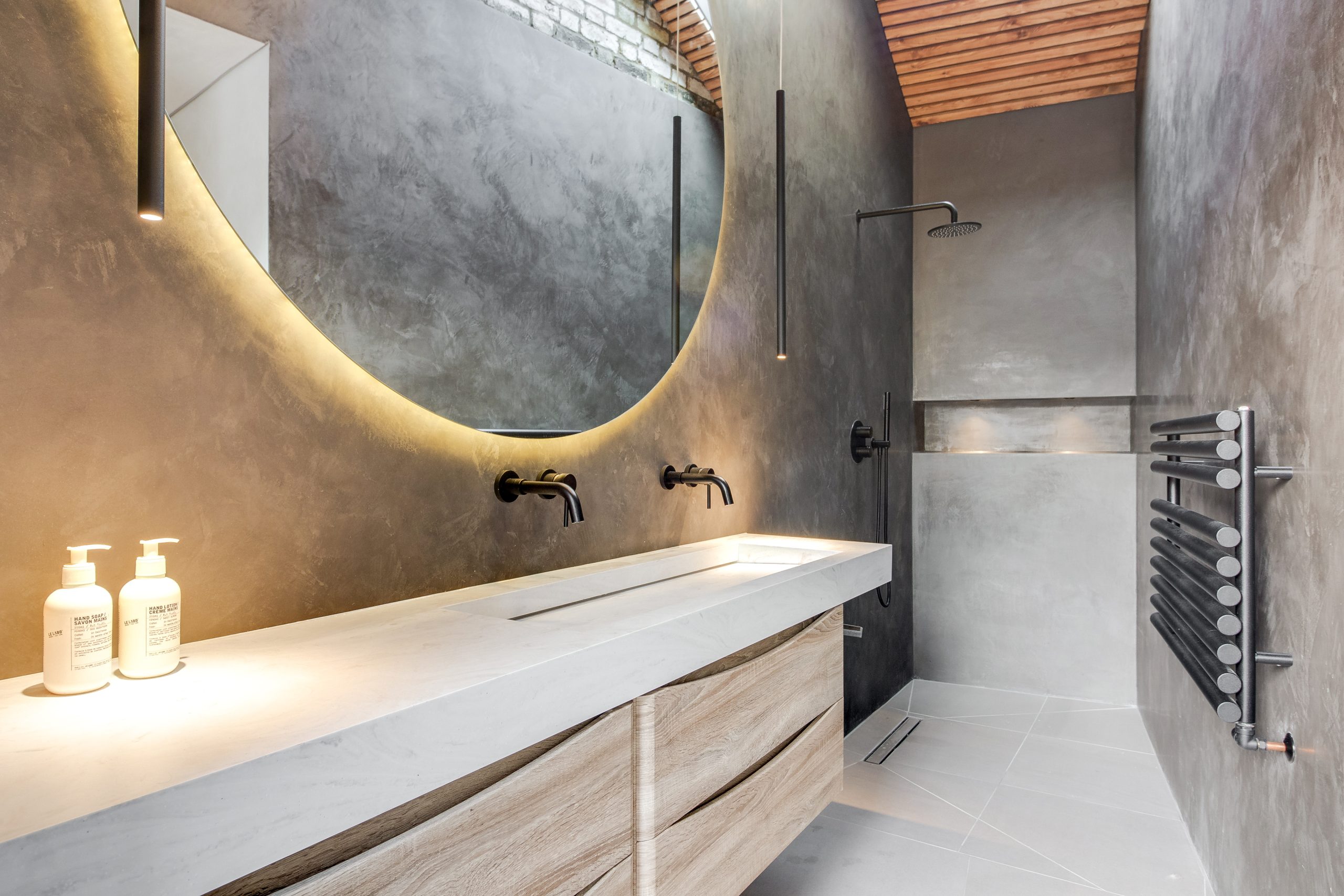 Prezentowana łazienka wpisuje się w styl industrialny i minimalistyczny. Dominują w niej surowe tekstury i szara kolorystyka, która jest przełamana akcentami naturalnego drewna, czarnych dodatków i oświetlenia o ciepłej barwie. Szare ściany i podłoga, przypominające beton architektoniczny nadają wnętrzu surowości, a jednocześnie eksponują umywalkę na zamówienie w kolorze Corian Limestone Prima. Dzięki temu zestawieniu, umywalka wprowadza jasne tony i przełamuje chłód szarości, co wpływa na ocieplenie aranżacji.