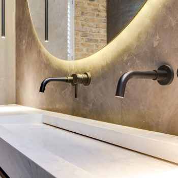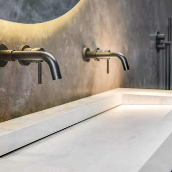 Umywalka Corian®, którą stworzono na indywidualne zamówienie, składa się z długiego blatu, zintegrowanego z szeroką misą. W ten sposób powstała komfortowa i estetyczna strefa do mycia dla dwóch osób. Kolor Corian Limestone Prima imituje natrualny kamień i wpisuje się w wystrój całego wnętrza.